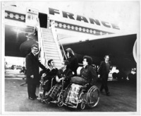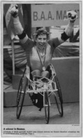 Photograph of Jean Driscoll winning Boston Marathon wheelchair title.