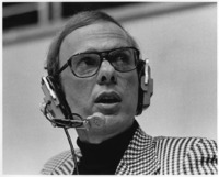 Photograph of Tom Jones doing commentary for a National Wheelchair Basketball Association (NWBA) game.
