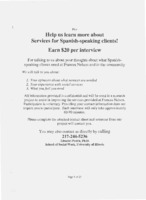 A flier asking for potential interviewees to contact the research team to answer questions about needed mental health services for the Spanish-speaking community. -