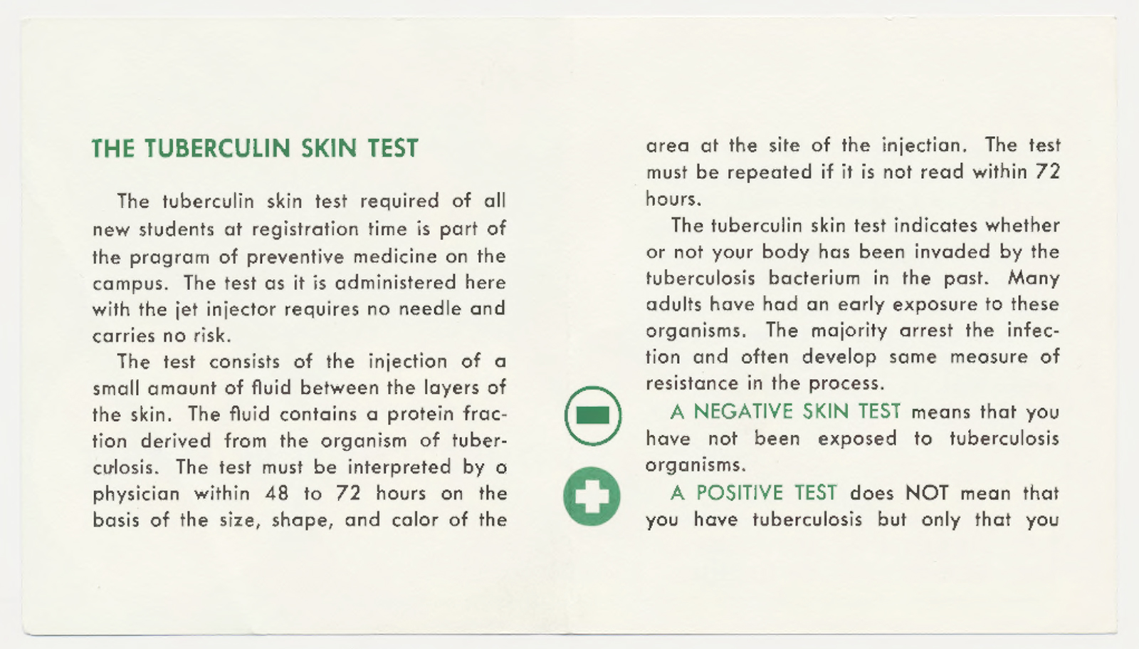 - A pamphlet explaining the use of a new, less time-consuming test for tuberculosis that would be required for all incoming students at the University of Illinois.