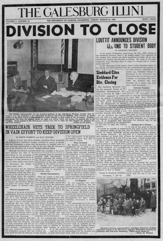 In early 1949, Governor Stevenson announced that the Galesburg Campus would be closed. Nugent and 30 students staged a march on the state capital in Springfield to try and dissuade Governor Stevenson. He avoided meeting with them but their efforts generated statewide media attention. In search of a new school to continue their education, many students visited Champaign-Urbana to demonstrate to administrators that that they could successfully negotiate the campus with minimal assistance. On May 4, 1949, the University of Illinois initiated plans to provisionally accept 14 of the students with disabilities from Galesburg for the fall semester in Champaign-Urbana. However, no other students would be allowed to enter, and no funding was established for the program.