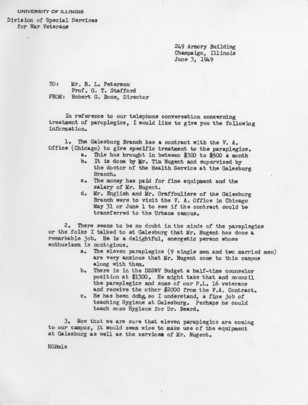 In a letter from June 3, 1949, Robert G. Bone, Director of Division of General Studies, discussed the possibility of transferring the program from Galesburg to Champaign-Urbana. Bone noted that Nugent "has done a remarkable job. He is a delightful, energetic person whose enthusiasm is contagious. . . . It would seem wise to make use of the equipment at Galesburg as well as the services of Mr. Nugent."