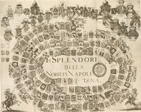 This "guioco d'arme" is a game in which players roll dice to advance along a track, loosely modeled on the game of the goose. The book contains the rules, with the engraved gameboard folded within. The purpose of the game is to help young nobles learn the names and coats of arms of the Neapolitan nobility, the ruling families, and the ranks of the government and church. The "way to honor" has two paths, either secular, ending with the king, or religious, ending with the pope. There are traps along the way: if you land on "Gerusalemme," the player has to recite "Dio lo vuole" and go on a pilgrimage (i.e., lose a turn).