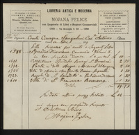 This receipt is for six books bought in 1879 for a total of fourteen lire after discount, signed by the bookseller with "profound respect, in devoted service." Two of the books listed on the receipt are duplicates in the collection, indicating perhaps that Cavagna did not keep track of his purchases, or simply could not pass up a good deal.