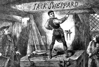"A narrative of all the robberies, escapes, &c. of John Sheppard" is thought to have been ghostwritten by Daniel Defoe, though the original author is unconfirmed. He would have based this account on his conversations with Jack Sheppard at Newgate prison. The biography sold “quickly and abundantly” on the day of Sheppard’s execution and is credited with much of Sheppard’s celebrity. This woodcut print depicts Sheppard’s escape from the condemned hold of Newgate in broad daylight with the help of his lovers and accomplices, Elizabeth Lyon and Poll Maggot.