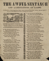 This lamentation tells the story of a man named Keene, convicted of killing his wife's son and sentenced to execution at Horsemonger Lane Gaol. "Lamentations of Keene," is told from Keene's perspective and details his remorse for the murder and his dread of judgement. Whether or not it was actually written by Keene is doubtful, though balladeers did occasionally interview prisoners for an extra "edge."