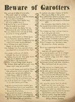 Despite a general decline in street crime during this period, there were two major moral panics over "garroting" in 1856 and 1862. Garroting is a method of strangulation used in robberies, where the thief uses a length of rope or wire to grab the victim from behind. However, in this context, it can mean mugging in general. Because of a few high-profile robbery cases and a large amount of press coverage, anxieties about the safety of London streets were on the rise. This ballad encourages the London police and the general public to beware of thieves and to "stick 'em, lick 'em, pinch 'em."