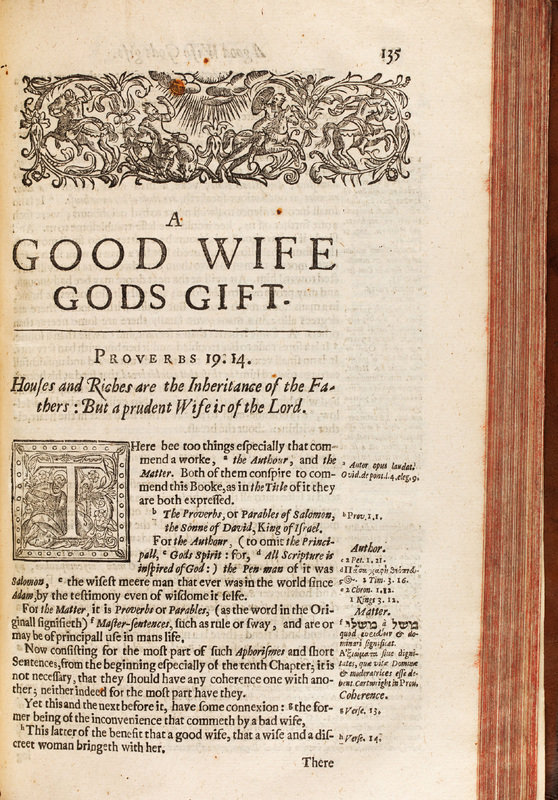 Another example of a moral sermon directed towards women. Edward Brewster (fl. 1621-1647) specialized in theological works. Fulke Clifton (fl. 1620-1644) specialized in broadsides and political pamphlets, which makes his commission of this particular work interesting. The notes are in Greek and Latin, easily accomplished by an established printing house such as Anne Griffin's, which would likely own several fonts of type.