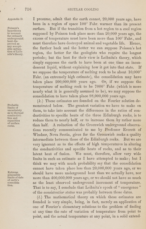 The search for an all-encompassing “theory of the Earth” (or “geotheory”) that could unite disparate natural observations was a much pursued (and sometimes much maligned) sub-discipline of the Earth sciences throughout the period covered by this exhibit. An intriguing offshoot of various geotheories were the attempts to calculate absolute chronologies from first principles, or assumptions and calculations based on an understanding of universally applicable physical processes. Collectively though, these estimates seemed unsatisfactory as absolute chronometers as they were based upon conjecture and assumption, rather than direct observation and measurement. New discoveries of the 20th century were required before true measurement-based estimates of the age of the Earth could be made.