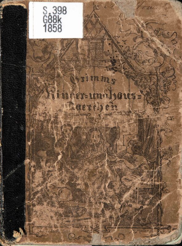The book pictured here is a small edition that contains 50 stories selected specifically for child readers in a single volume. This 1858 version is the final edition published by the Grimm brothers. The cover, likely illustrated by Ludwig Pietsch, appears to depict a man reading stories to his family in their home as many German families would have done during this time. Popular fairy tales in this volume include "Hansel and Gretel," "Cinderella," "Little Red Riding Hood," "Sleeping Beauty," and "Snow White." There are countless variations of these stories around the world, both due to the Grimm brothers' influence and cross-cultural influence in the German oral tradition.