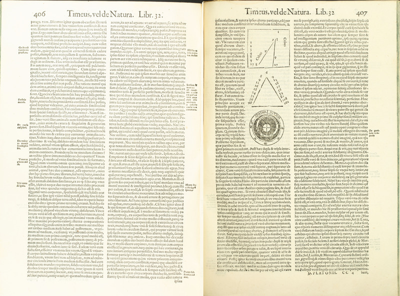 This translation and commentary on the Timaeus by the humanist Loys le Roy (1510?-1577) contains the first known translation of the dialogue from Greek into French. The volume belongs to the second printing of Le Roy’s translation, produced in Paris by Abel l’Angelier in 1582 (click here to see the title page). It also contains a French translation of Plutarch’s treatise on the creation of the soul., an event which Plato describes in the Timaeus. The text is divided into four parts, although the precise point of division between the third and fourth parts is uncertain. Marginal numbers, such as the ‘4’ printed on the left page displayed, direct the reader to endnotes printed after the section. Simple diagrams are printed occasionally throughout the work. The Timaeus passage shown treats bodily diseases, particularly how they arise and are propogated. The Greek note in the margin is a direct quotation from Timaeus 82e: ὅταν γὰρ τηκομένη σάρξ, meaning “whenever flesh decomposes.”