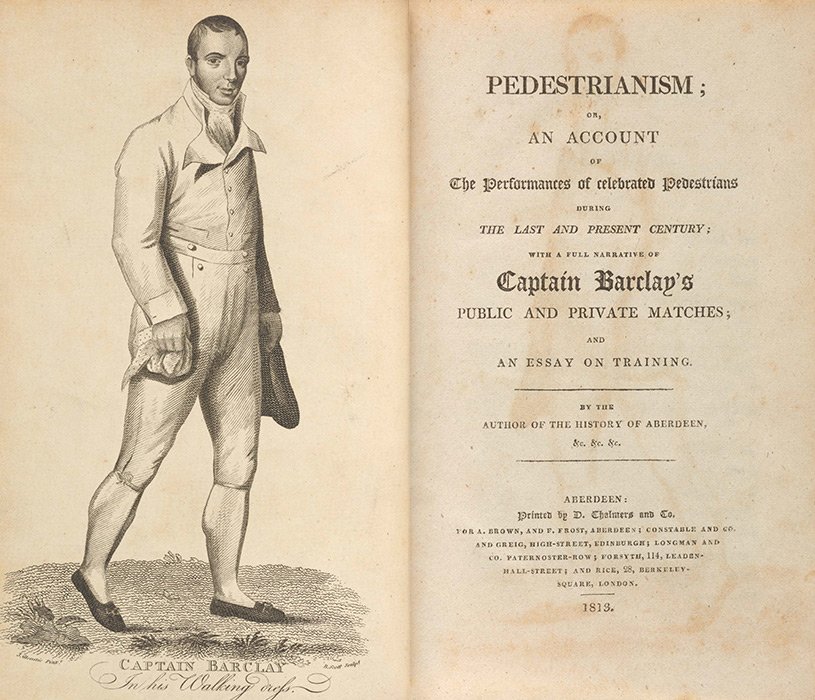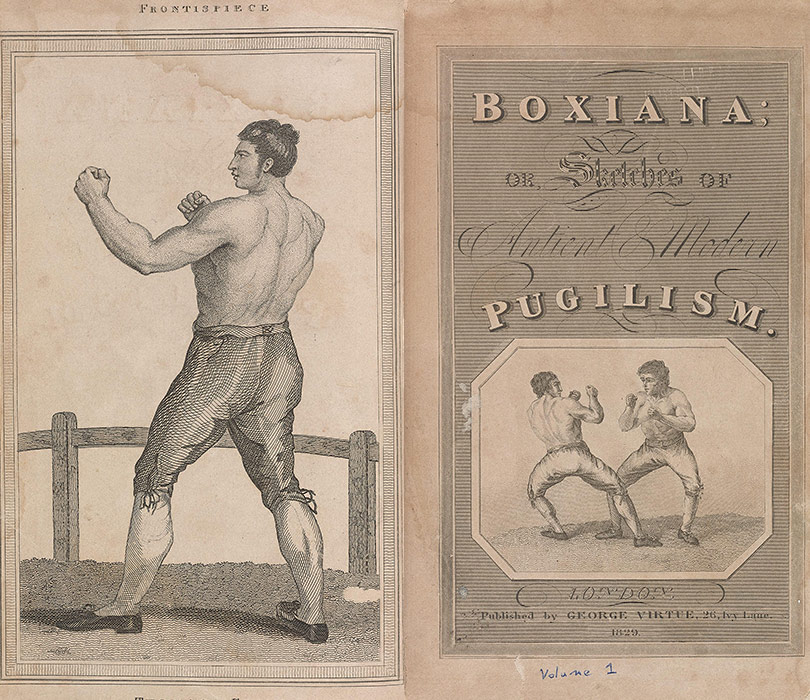 The Regency approach to men’s fashion was also influenced by an increasing emphasis on physical activity and fitness as an attractive, gentlemanly enterprise. Driving, horse racing, pedestrianism, boxing, fencing, and hunting were all commonly undertaken. Gymnastics was an option as well. Not all gentlemen participated directly, of course; wagering (including upon the outcomes of sporting activities) was one of the most popular forms of gambling, along with playing cards. The images above the case here depict two major pastimes for Regency gentlemen: hunting and horse racing. Two of the most prominent writers about sporting pastimes, Pierce Egan (pugilism) and George Tattersall (of the most famous Regency stable for acquiring horses, Tattersall’s) have several works in this exhibition.