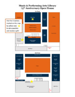 This document includes a map of the Music and Performing Arts library, with yellow stars indicating the three stations where attendees can ask a question in order to receive one of the giveaway items.
