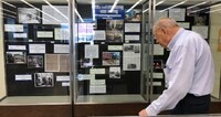 In this photo, University of Illinois Professor Emeritus Donald Krummel is seen looking at the Display cases for the Music and Performing Arts Library's 75th Anniversary Exhibit.