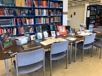 Many MPAL items are laid out across two tables. Their selection is representative of the wide variety of interesting materials collected by MPAL over the years. Materials shown include books, plays, scores, player piano rolls, loanable tech, LPs, CDs, DVDs, and microfilm.