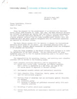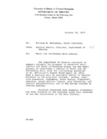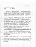 This note from Director of Technical Services Robert L. Talmadge is in response to the recently submitted proposal for a Performing Arts Library at the University of Illinois. Talmadge reports a positive review and submits additional questions for the Performing Arts Library Committee to answer.