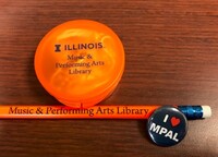 Photo of three objects branded with Music and Performing Arts Library: an orange plastic cylindrical case containing white earbuds, an orange and blue pencil, and a black button with white text and a red heart spelling out "I [heart] MPAL."