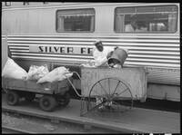 Worker emptying trash from Zephyr coach, 14th Street passenger yards, Chicago, May 1948