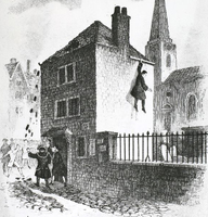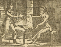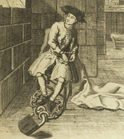 "A narrative of all the robberies, escapes, &c. of John Sheppard" is thought to have been ghostwritten by Daniel Defoe, though the original author is unconfirmed. He would have based this account on his conversations with Jack Sheppard at Newgate prison. The biography sold “quickly and abundantly” on the day of Sheppard’s execution and is credited with much of Sheppard’s celebrity. This woodcut print depicts Sheppard’s escape from the condemned hold of Newgate in broad daylight with the help of his lovers and accomplices, Elizabeth Lyon and Poll Maggot.